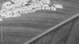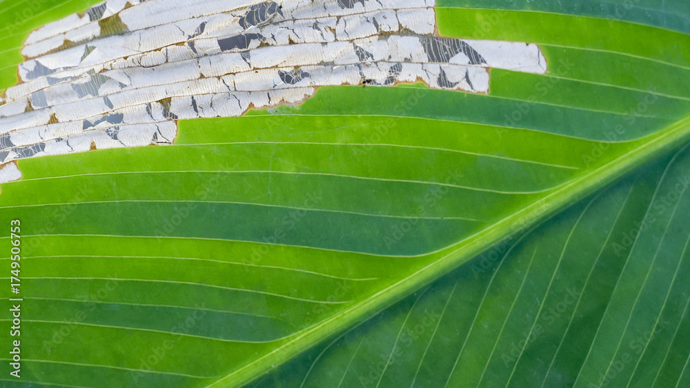 Macro close up of damaged green leaf showing intricate texture and decay. This abstract background of nature illustrates fragile beauty of plant struggle