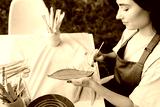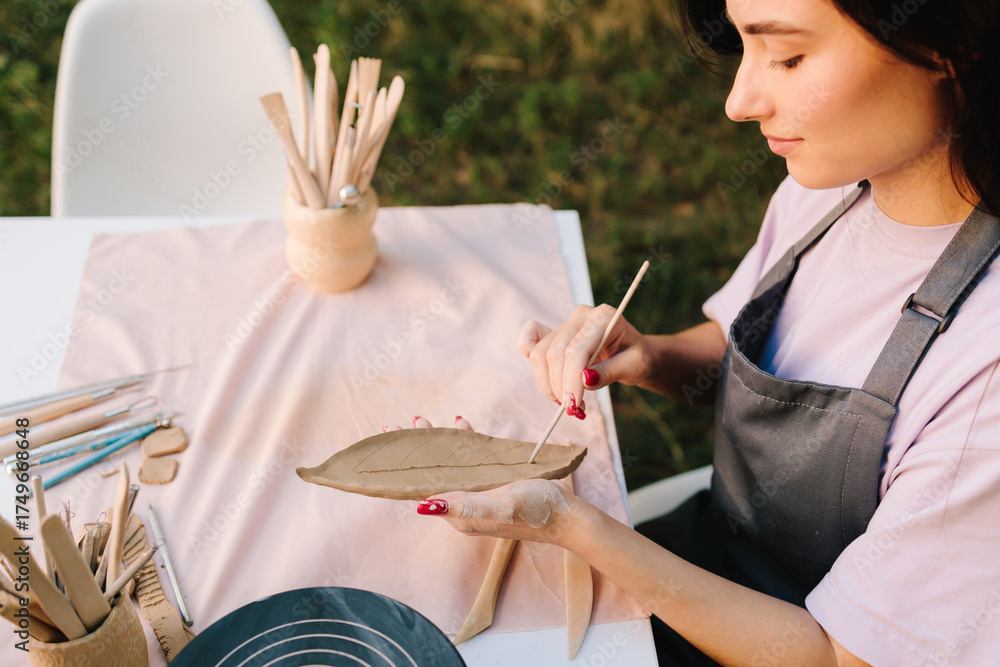 Artisan engraves a clay leaf with detailed lines. Woman Carving Clay Leaf. Young woman carves delicate leaf patterns into clay, showcasing her pottery skills.