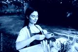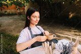Artist works carefully on a clay bowl, smoothing its form with a sponge. Young Woman Shaping Clay Bowl. Potter smooths a clay bowl with a sponge on a wheel, refining shape and texture.
