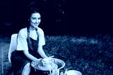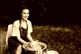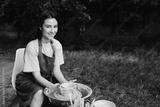 Young woman smiling while working with clay on pottery wheel. Girl shapes clay on the pottery wheel with smile. Smiling artisan shapes clay on the spinning pottery wheel.