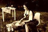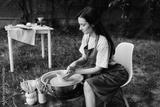 Girl shapes clay on the pottery wheel with smile. Smiling artisan shapes clay on the spinning pottery wheel. Young woman smiling while working with clay on pottery wheel.