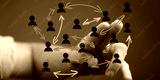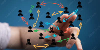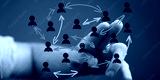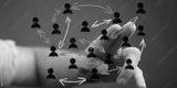 Hand interacting with network icons. Collaboration, teamwork, connection concept.