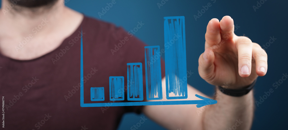 Stock photo of a man interacting with a decreasing bar chart, illustrating decline, loss, or downturn.