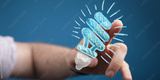 Creative hand interacting with a futuristic glowing light bulb symbol. Represents ideas, solutions, energy, and innovation in a digital concept.
