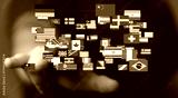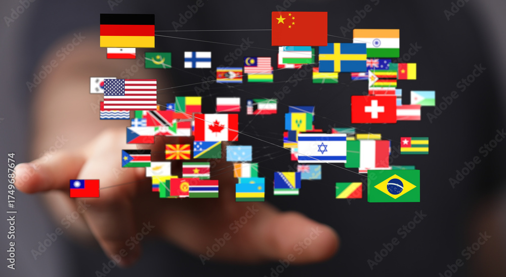 A person's hand holding flags from around the world, representing globalization, connections, and unity. Illustrates global concepts of communit