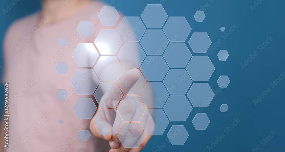 Abstract image of a hand interacting with a futuristic digital interface. Perfect for technology, innovation, and connection concepts