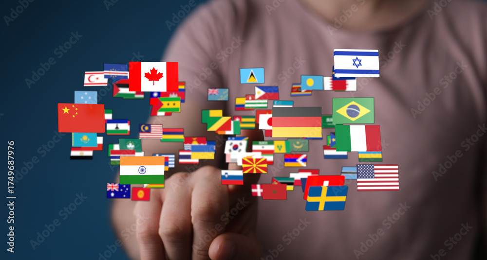 A hand pointing towards a collection of national flags symbolizing international cooperation, global connections, and cultural exchange, ideal f