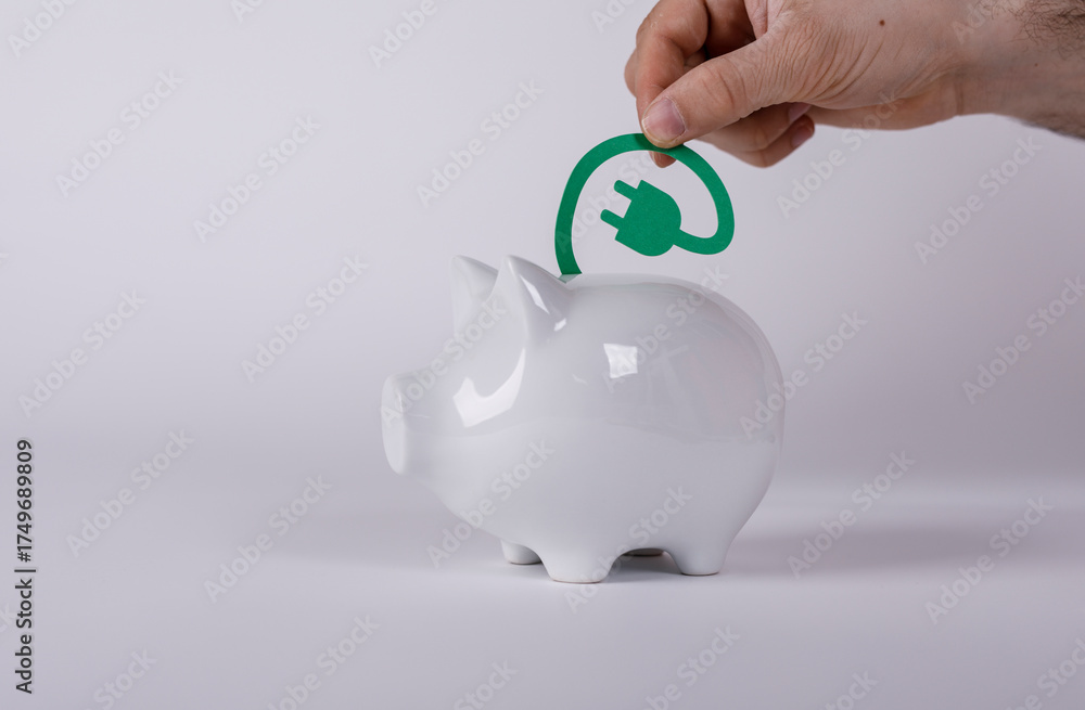 Conceptual image of saving money and investing in sustainable energy sources. A hand placing a green plug into a piggy bank representing investm
