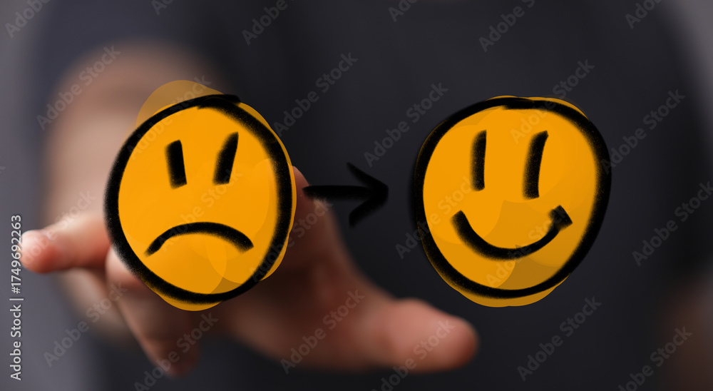 Visualizing emotional transformation: a hand guides a sad face to become happy. Perfect for themes of therapy, self-help, mood improvement, and