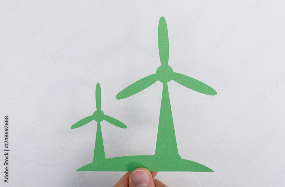 A person's hand holding green paper cutouts of two wind turbines against a white background, symbol of sustainable energy, eco-friendly, and cli