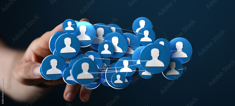 Conceptual shot showing a hand presenting social media network icons, depicting human resources, HR management and global connectivity.