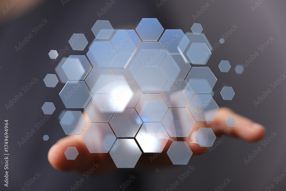 Abstract image of a hand interacting with a digital hexagon network. Perfect for tech, innovation, and connection conce