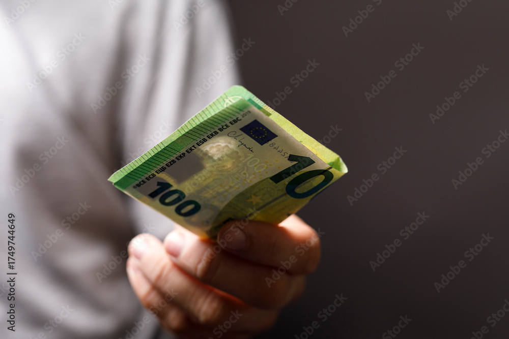 Close-up of a person holding a 100 Euro banknote, symbolizing financial transactions, wealth, and the European economy. Suitable for financial a