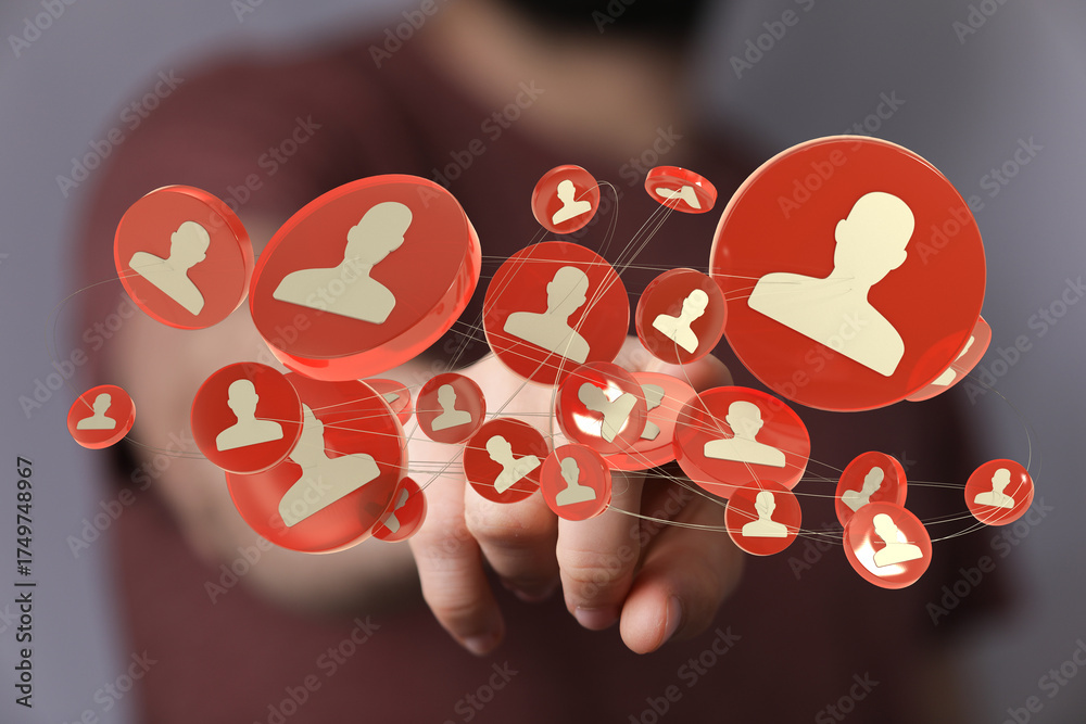 A network of red connected user profile icons are arranged to create a social network. Communication is the concept.