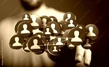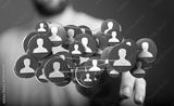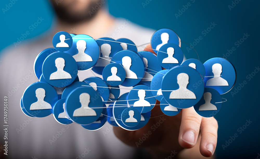 Illustration of connection through blue people icons for topics of community, social networking, HR and online communication.