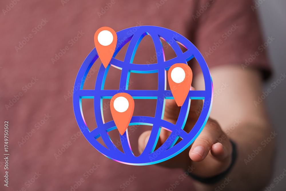 Hand holding digital globe with location markers. Perfect for global business, travel, connection concepts.