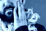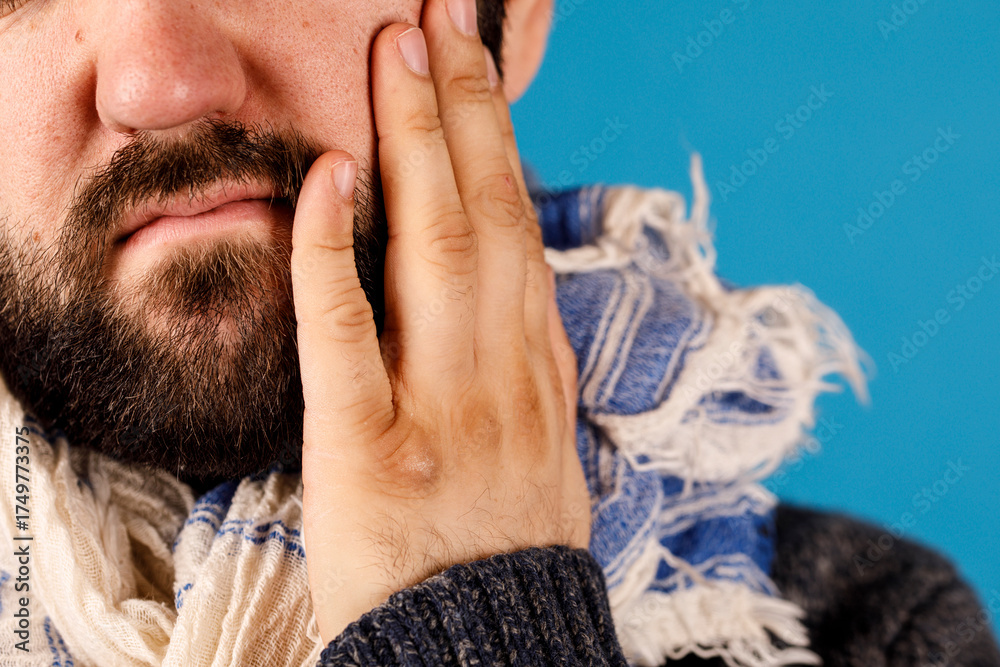 Close-up of a man suffering from a toothache, touching his cheek in pain. Healthcare and dental concept. Pain and suffering on a blue background