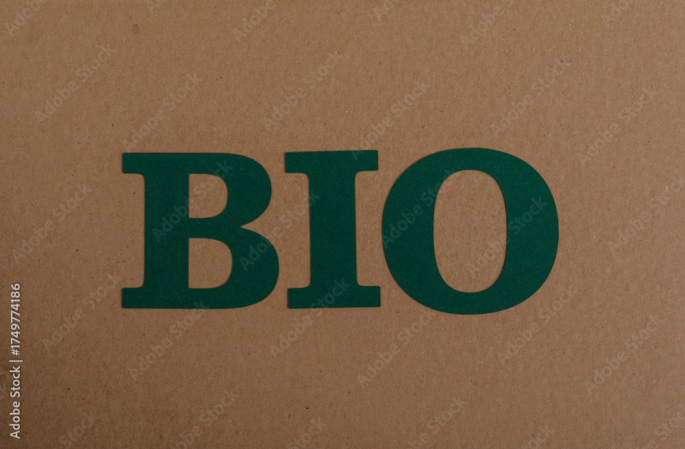 A close-up shot of the word BIO, made from green letters on a brown background. Represents concepts of nature, organic, and eco-friendly lifesty