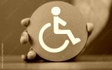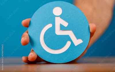 A person holds a wheelchair accessibility symbol, signifying inclusivity, against a blue background, representing accessibility and equality.