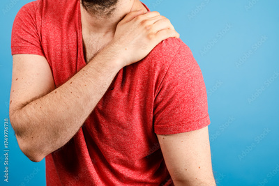 A man in a red shirt touches his shoulder, expressing pain. The image depicts discomfort, healthcare, and body ache.
