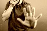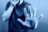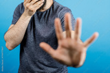 A man covers his face with one hand while making a stopping gesture with his other hand against a blue background. Represents protection, reject