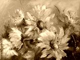 Abstract oil painting of blooming flowers in warm yellow and white tones with textured brushstrokes on canvas