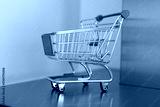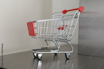 A small shopping cart with red details sits on a reflective surface. The image highlights concepts like shopping, retail, and the idea of buying