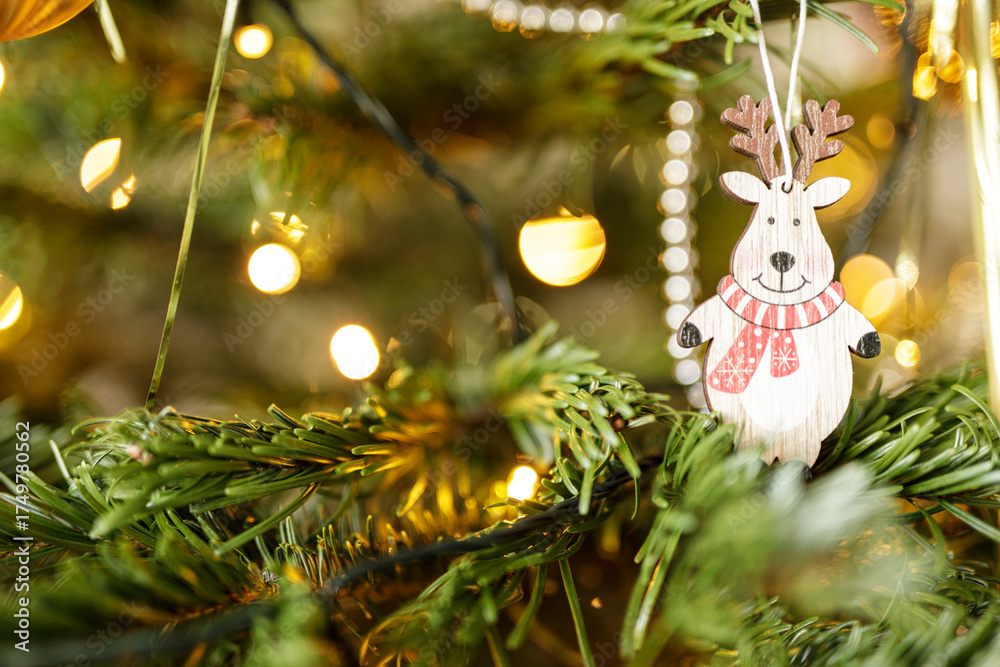 Festive Christmas scene with a wooden reindeer ornament on a Christmas tree adorned with glowing lights. Holiday cheer and seasonal decoration