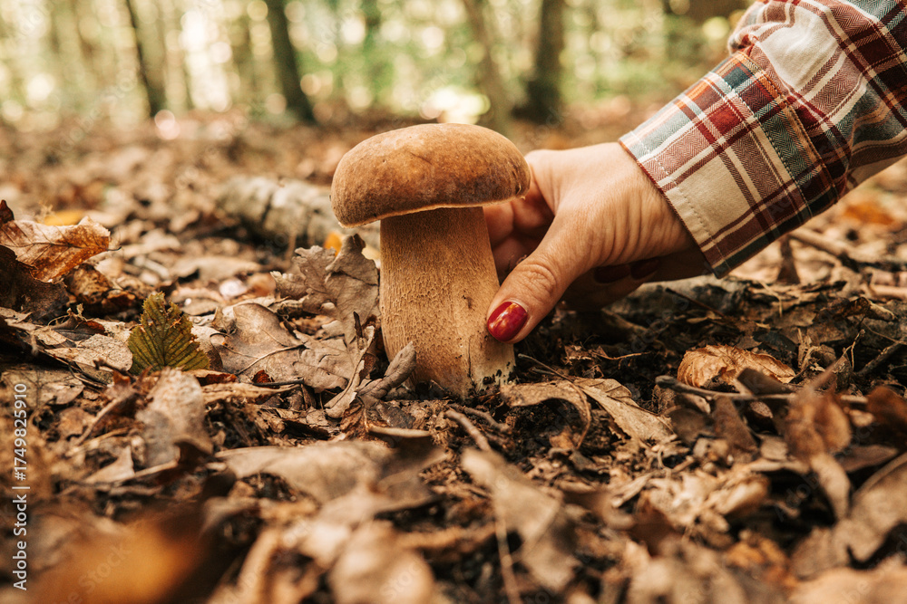Womans hand reaching to pick porcini mushroom growing in lush autumn forest