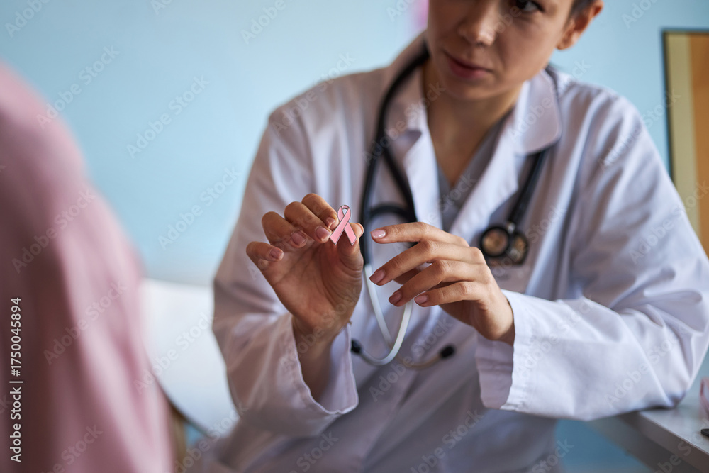 Young adult Caucasian female doctor holding pink cancer awareness ribbon while explaining breast cancer prevention to unseen patient during medical consultation in clinical setting