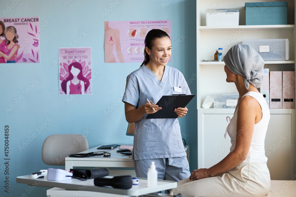 Young adult Caucasian female nurse smiling while holding clipboard and talking with middle aged Caucasian woman, wearing headscarf, sitting in medical office during cancer consultation