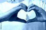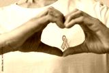 Middle aged Caucasian woman forming heart shape with hands in front of chest, wearing shirt with pink ribbon symbol, representing breast cancer awareness and support