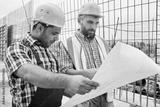 Two men wearing hard hats examining construction blueprint together at building site with exposed steel framework in background