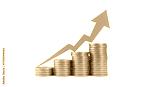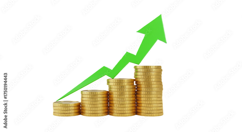 stack of golden coins with a green upward arrow isolated on white background, symbolizing financial growth, investment success, and economic progress
