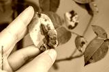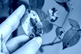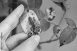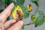 Cropped shot view of gardener hand touching yellow rose leaves before removing. Black spot is a fungal disease (Diplocarpon rosae) that affects roses.