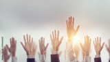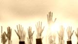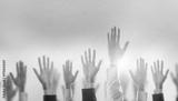 Silhouette, Businessman Hands raising for Participation with sunlight. copy space.