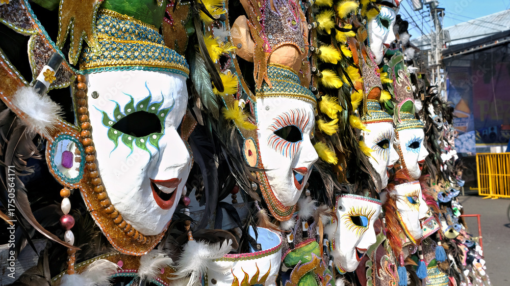 Dynamic Row of Smiling MassKara Festival Masks with Rich Detail and Feathers