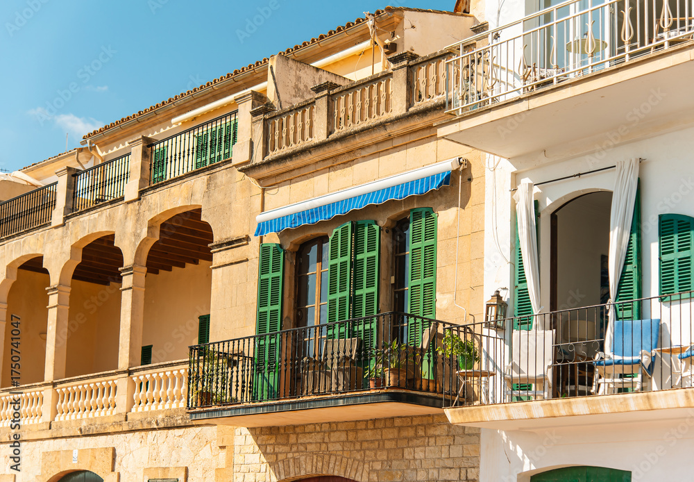 Traditional Spanish house with a balcony. Shuttered windows and balconies in Mallorca