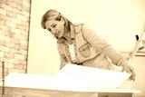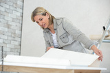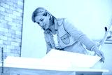 woman doing repairs in apartment wallpapering on wall