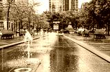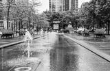 Victoria Square Metro station park with fountains during rainy cloudy day in city in Quebec region