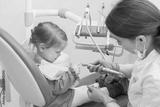 Little girl sitts in dental chair at dentist office talking with female doctor