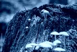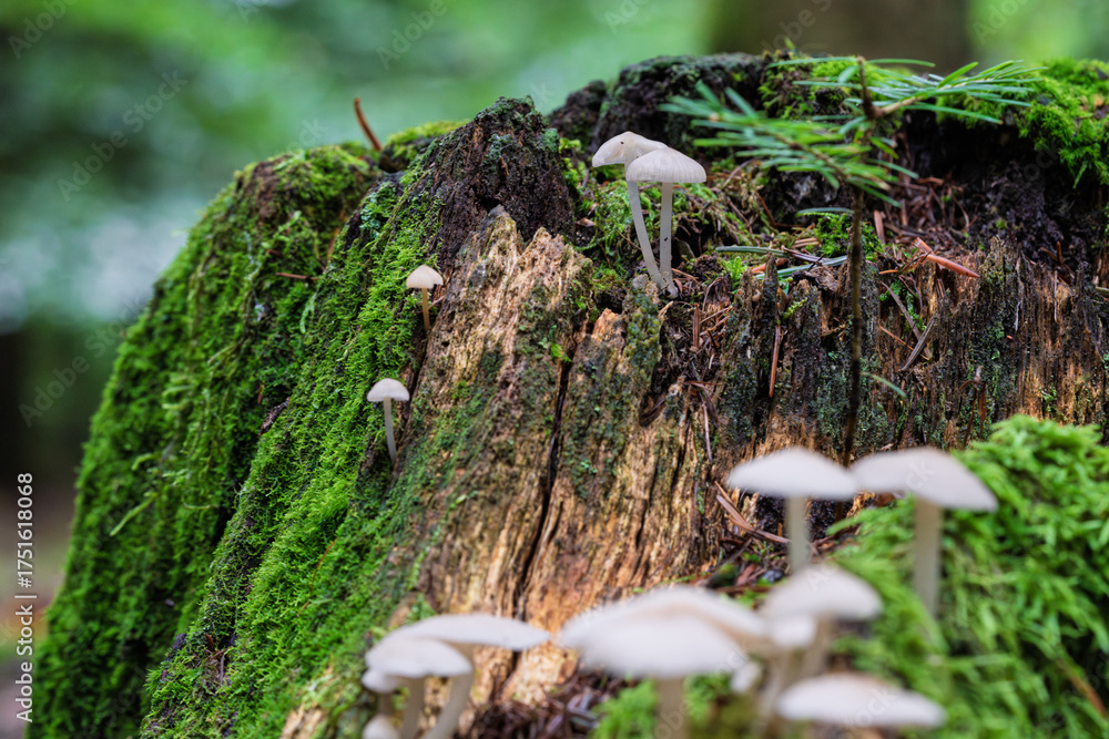 Mushrooms grow on a forest stump surrounded by bright lush green moss in nature
