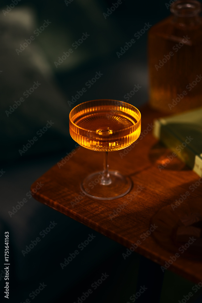 Close-up of an elegant cocktail glass filled with an amber drink, bathed in warm evening light on a wooden table. A cozy and sophisticated still life scene.