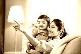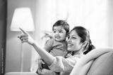 Young Indian mom holding her baby boy on sofa, expressing love and joy of motherhood