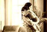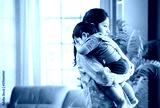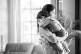 Indian Mom gently holding sleeping infant boy on shoulder, bonding quietly in bright modern home