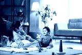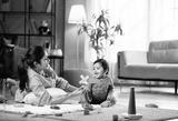 Indian Mother and infant boy playing ring toys on carpet together in bright modern home