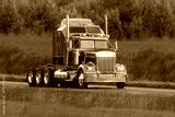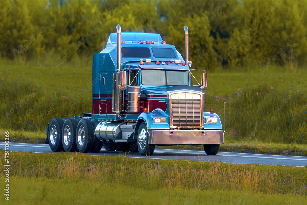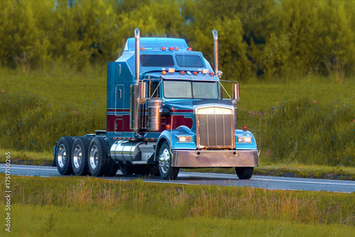 Old-fashioned American semi truck in farmland