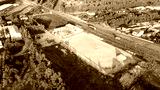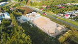 Aerial view of a new commercial building being constructed near a highway with construction workers