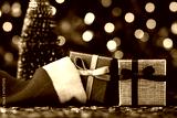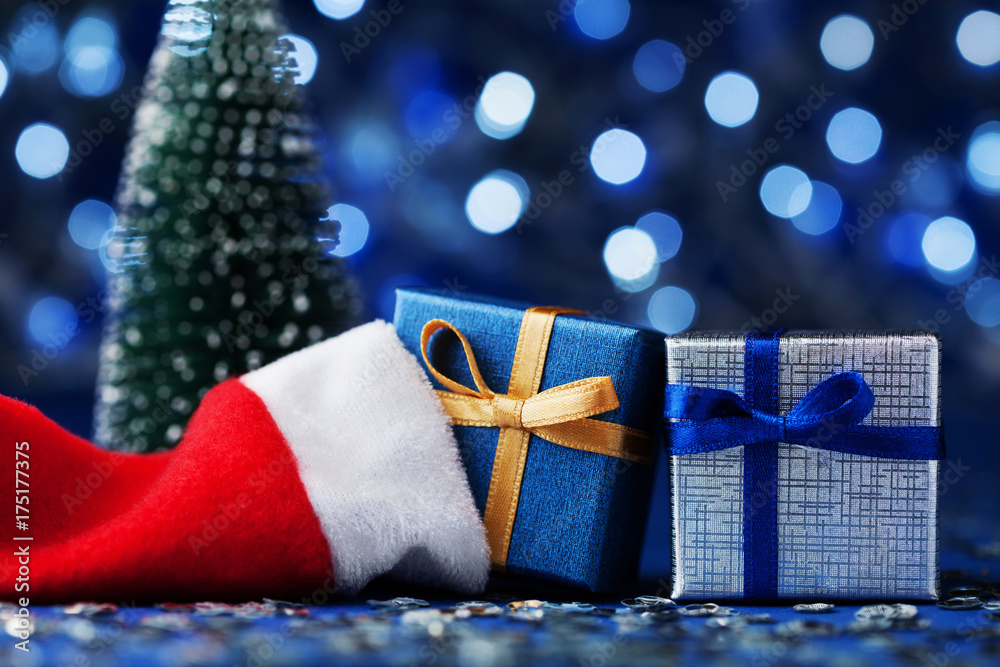 Fir tree, santa hat and christmas gift box or present on blue bokeh background. Magic holiday greeting card.