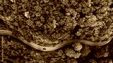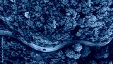 Top view road in beautiful autumn forest at sunset, trees with red and orange leaves , Beautiful landscape view from flying drone in Nature